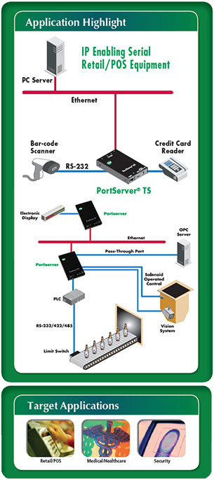 Los dispositivos PortServer TS son ideales para aplicaciones que requieren puertos COM o donde se necesita funcionalidad TCP / UDP sockets o multicast. Todos los servidores de dispositivos Digi incluyen la tecnología patentada por Digi RealPort ® COM port redirector, que permite establecer una conexión entre el host y el dispositivo serie conectado en red mediante la creación de un puerto COM o TTY local en el host, permitiendo a las aplicaciones existentes trabajar sin necesidad de modificación alguna.